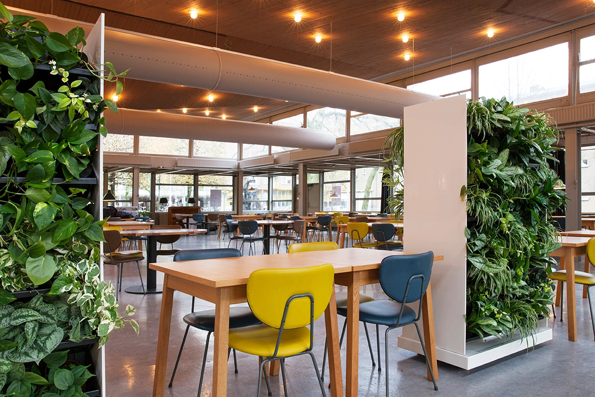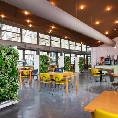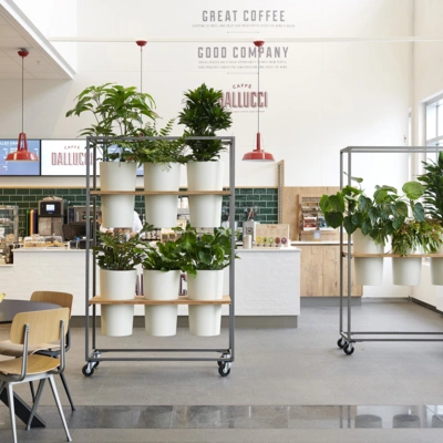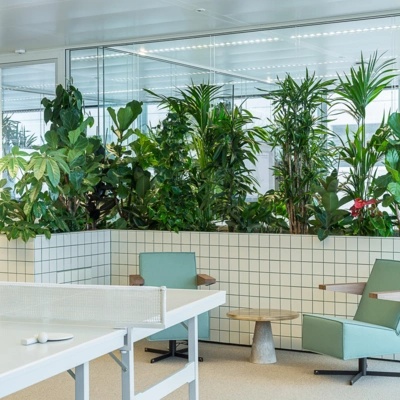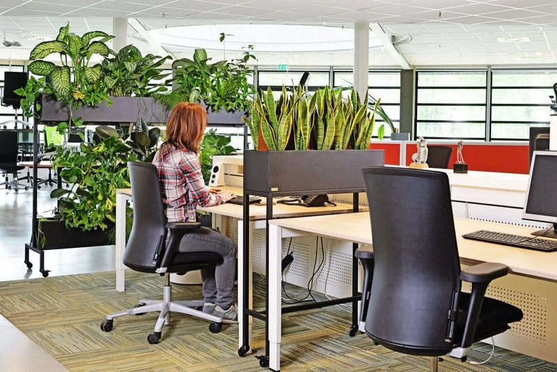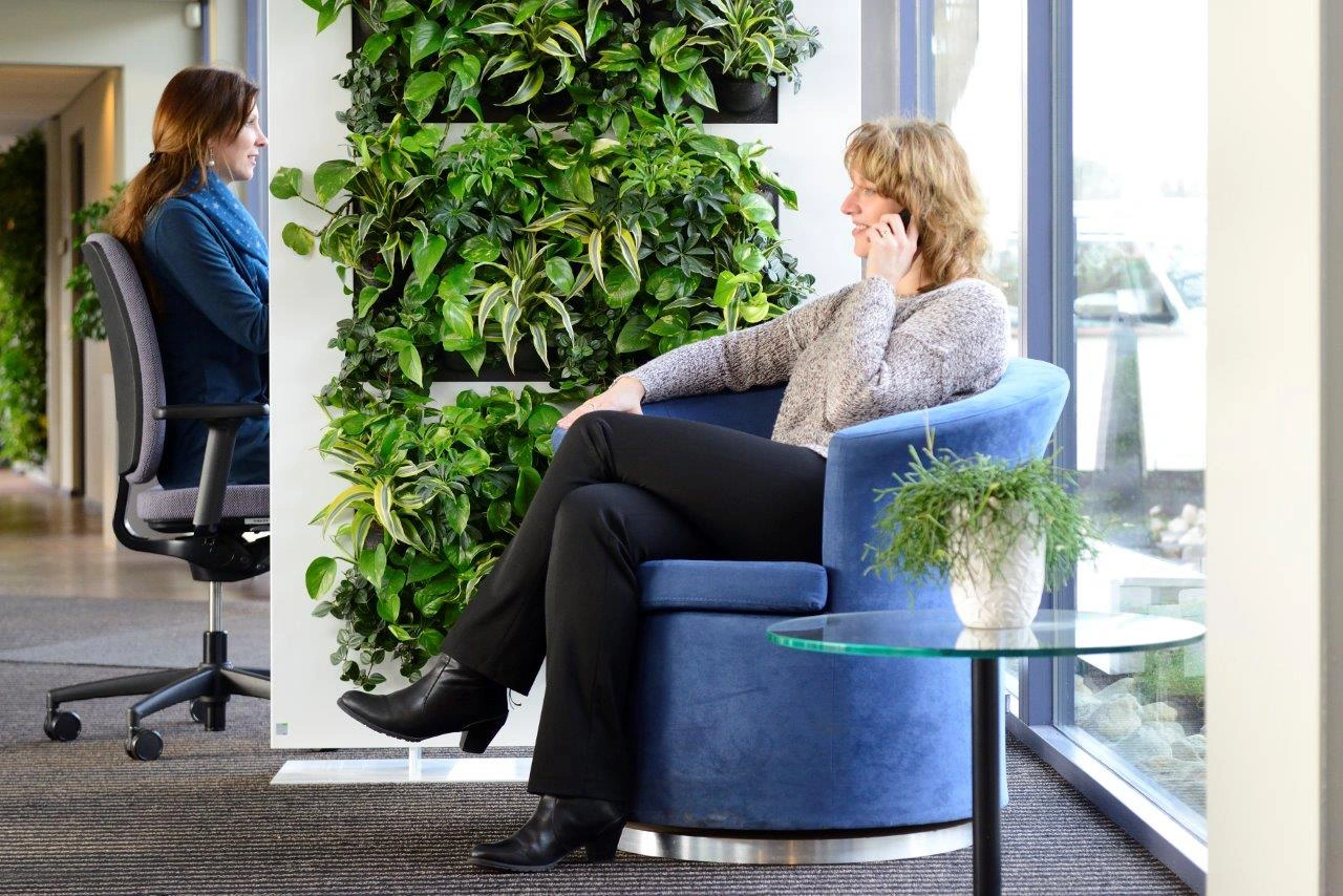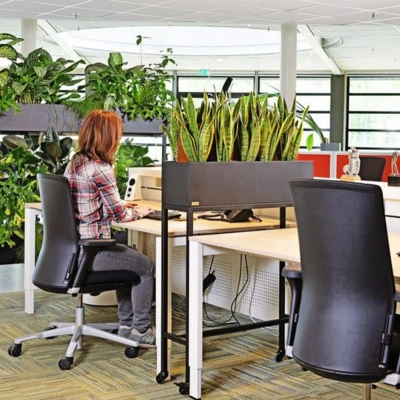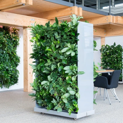De groene kantoor divider maakt het mogelijk een (werk) ruimte op een speelse wijze, praktisch op te delen. De omgeving krijgt door het verplaatsbare karakter steeds een andere uitstraling. De planten zelf zorgen voor privacy en dragen bij aan een demping van het omgevingsgeluid. We gebruiken groen om ruimtes te verdelen. Rust te creëren tussen werkplekken en groen te combineren met een geluid en of privacy vraagstuk.